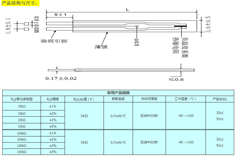 R25范圍:1.0×102Ω-6.8×105Ω,電阻值誤差級別有±1%、±3%、±5%、±10%;B25/50值范圍:2500K-5000K,B值誤差級