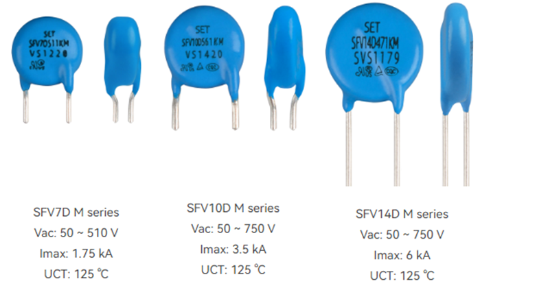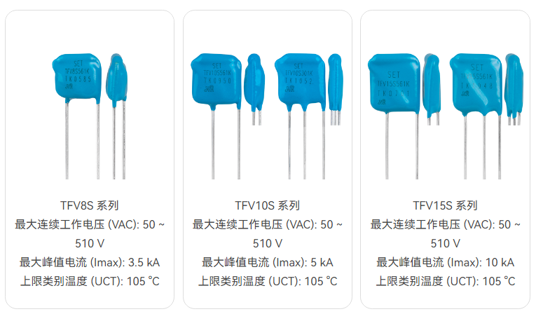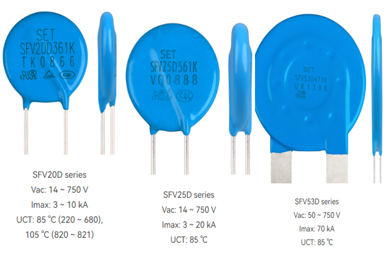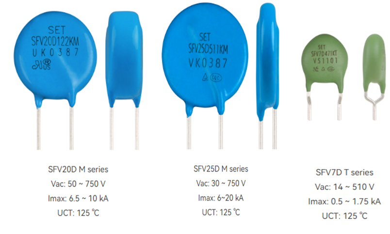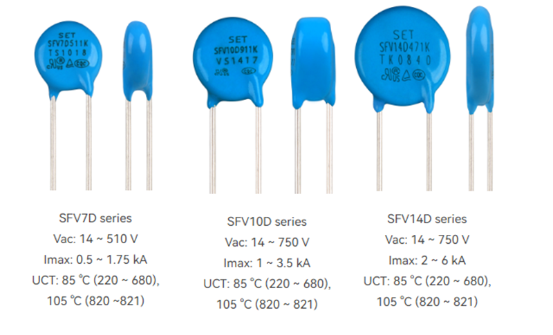 東莞市愛多電子(Eidoll)銷售的SET的金屬氧化膜壓敏電阻 (MOV)是以氧化鋅 (ZnO) 為主要成分的非線性電阻元件,該元件浪涌電流耐量及非線性系數非常大,在閾值電壓以下時,電阻非常高,幾乎沒有電流流過,如果超過該閾值電壓,電阻急劇降低,可以泄放大電流。由于具備這種特性,MOV作為電子、電氣設備的保護元件,對異常電壓的吸收,雷擊浪涌的吸收等發揮著很大的作用。賽爾特(SETsafe | SETfuse)公司的壓敏電阻 (MOV)具有高通流密度、低限制電壓、良好的交流耐受能力,可以根據客戶要求定制。具體的產品規格如下: