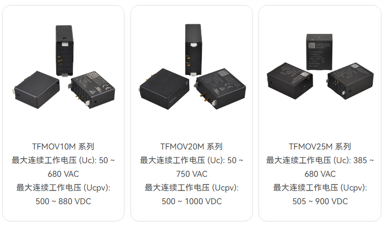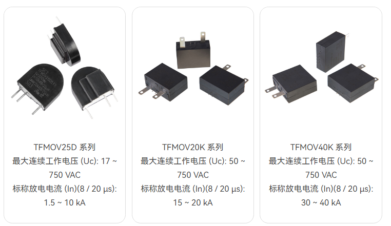 熱保護型壓敏電阻(TFMOV)是壓敏電阻與熱保護脫離部件的組合。壓敏電阻存在老化特性,熱保護型壓敏電阻能夠在壓敏電阻(MOV)劣化或失效時,通過熱保護部件的動作將壓敏電阻從主回路中脫離。常用于光伏逆變器,通信設備,機房電源等對可靠性和耐候性要求高的場所。