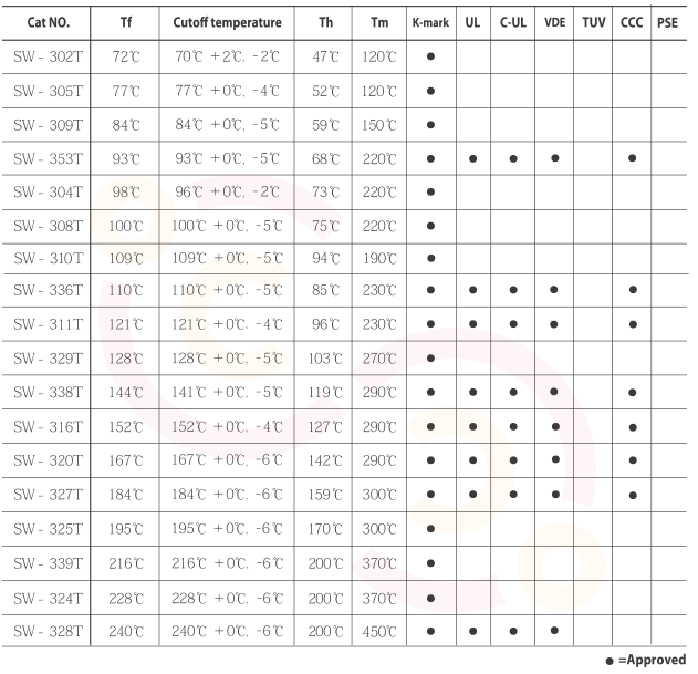 型號有:SW-302T 72, SW-305T 77℃,SW-309T 84℃,SW-353T 93℃,SW-304T 98℃,SW-308T 100℃,SW-310T 109℃,SW-336T 110℃,SW-311T 121℃,SW-329T 128℃,SW-338T 144℃,SW-316T 152℃,SW-320T 167℃,SW-327T 184℃,SW-325T 195℃,SW-339T 216℃,SW-324T 228℃,SW-328T 240℃.