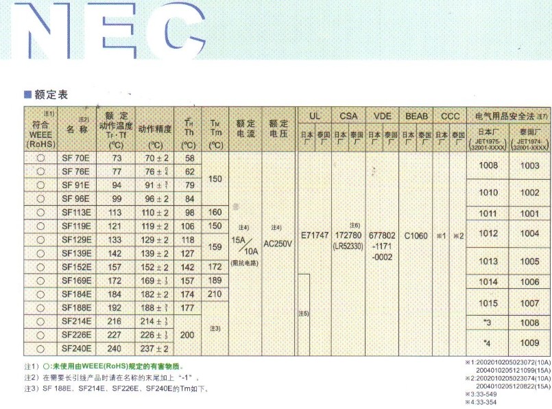NEC SEFUSE SCHOTT SF-E系列溫度保險絲