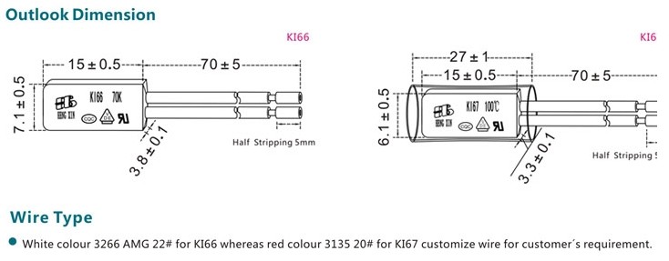 KI66/67 thermal protector is compose by neat conductive metal shell, bimetal component welded silver alloy through current conductive frame, insulated fixing seat, static contact pad, heat resistant wire, etc. When the current goes through the bimetal component with impedance, if the current increase or environment temperature rises and the temperature reaches the preset value, the bimetal component will work and release the contact to shut off the circuit, and by contrast, if the device cool down to the safe temperature, the contact point will reset automatically.