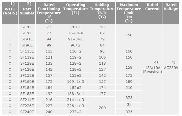 7) SF/E is available for rating 10A and 15A marking for PSE standard. Rating 10A marking is applied for Article 1, and Rating 15A marking is applied for Article 2 of the technical requirement of the METI ordinance J60691. Please select suitable rating product according to the specificatoin of end-application.